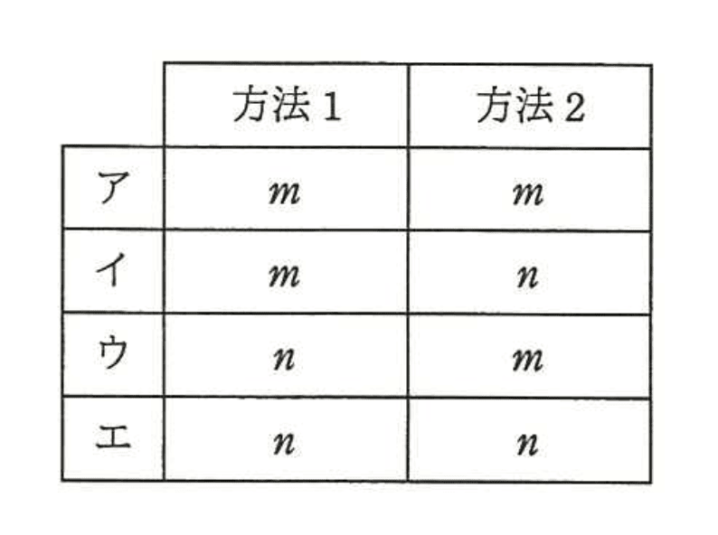 - イ(方法1=m、方法2=n):両方とも逆になっているため誤り。