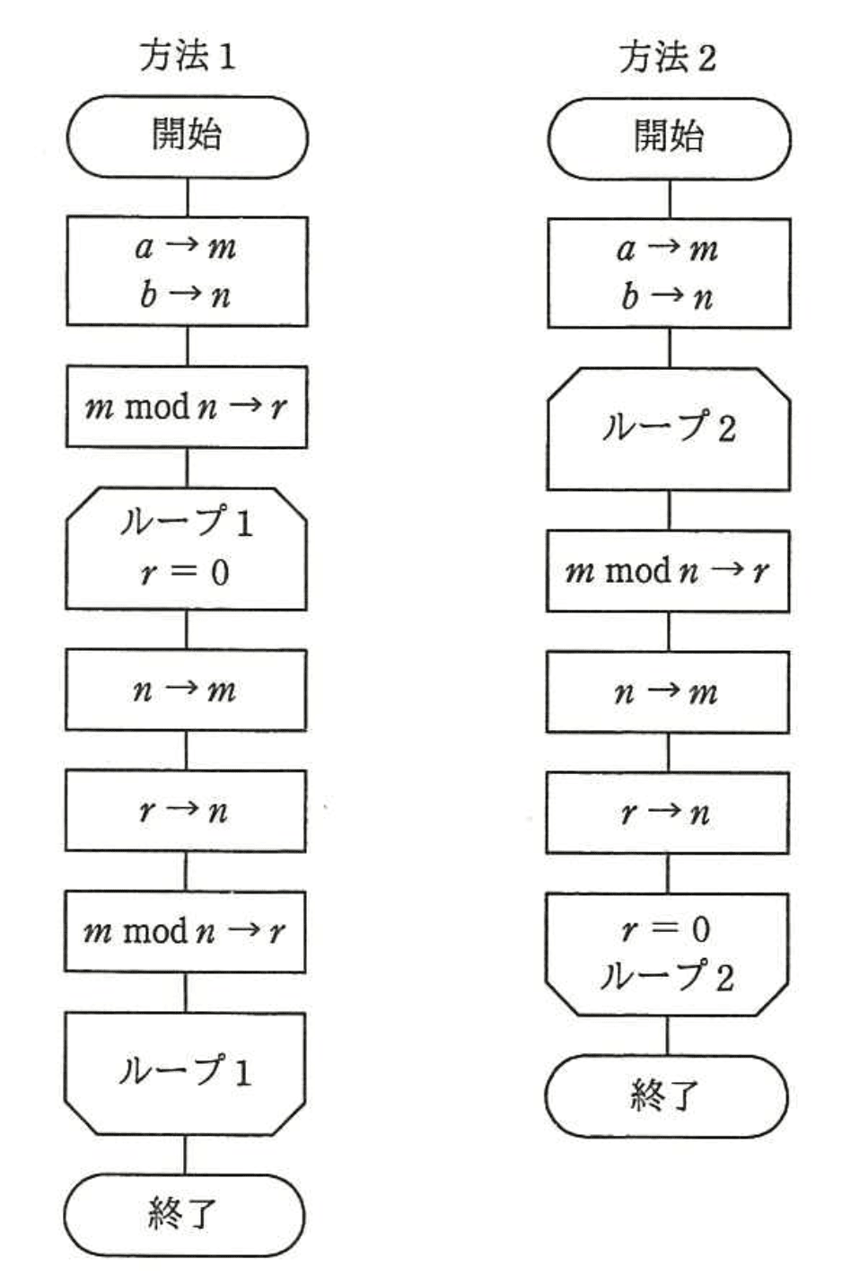 - 根拠:方法1はループ終了時に「r=0」となり、その時の「n」が最大公約数である。方法2はループ条件が「r=0」になるまで続き、終了時の「m」が最大公約数となる。