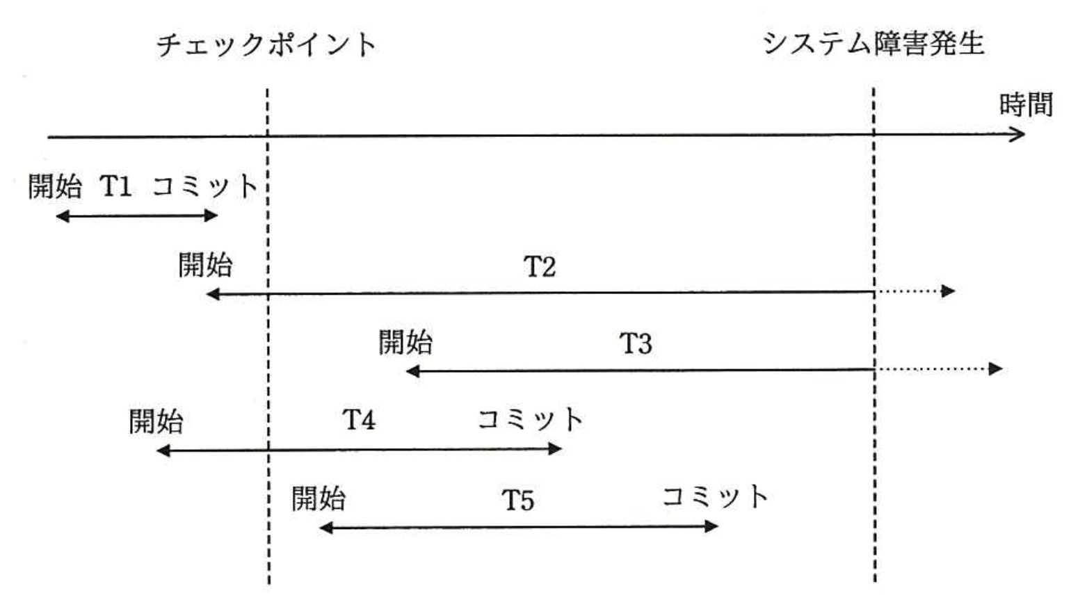 - T4とT5はチェックポイント後に開始し、障害発生前にコミット済みなので、ログ適用により回復可能です。
