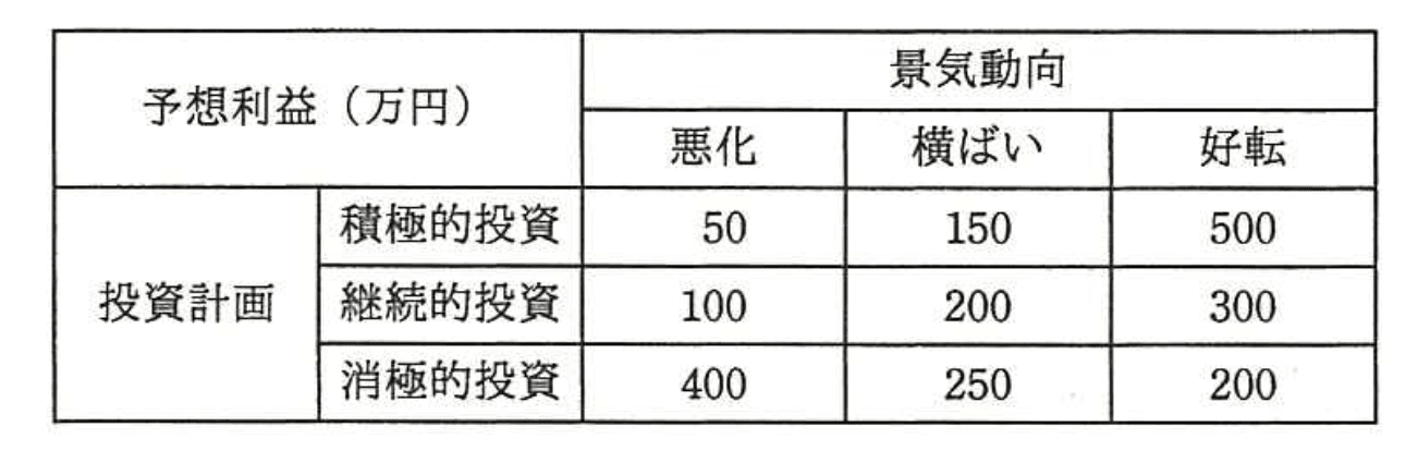 経営会議で来期の景気動向を議論したところ、景気は悪化する、横ばいである、好転するという三つの意見に完全に分かれてしまった。来期の投資計画について、積極的投資、継続的投資、消極的投資のいずれかに決定しなければならない。表の予想利益については意見が一致した。意思決定に関する記述のうち、適切なものはどれか。