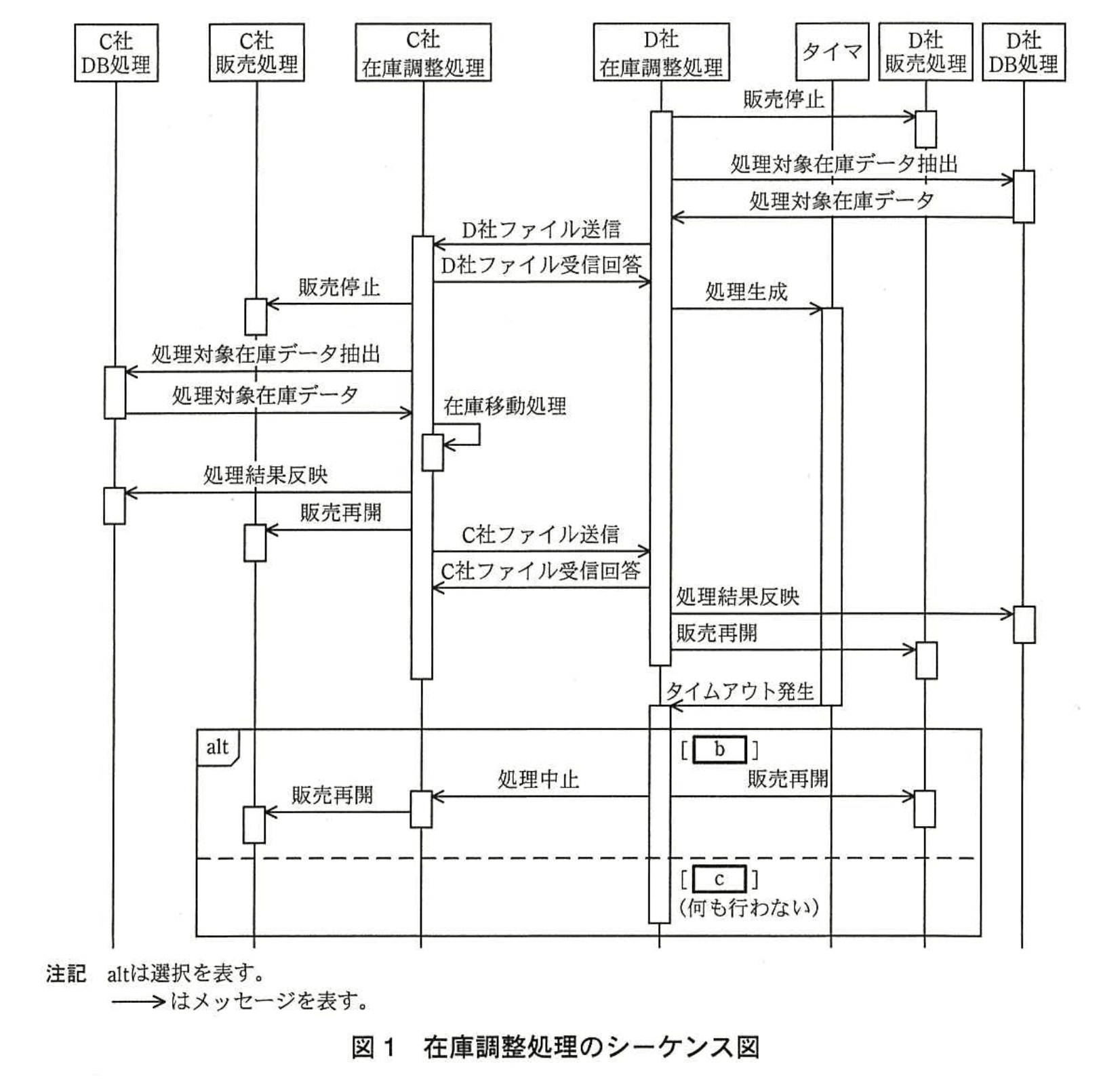 E氏とF氏は、ここまでの検討を基に処理のシーケンス図を作成した。作成したシーケンス図を図1に示す。