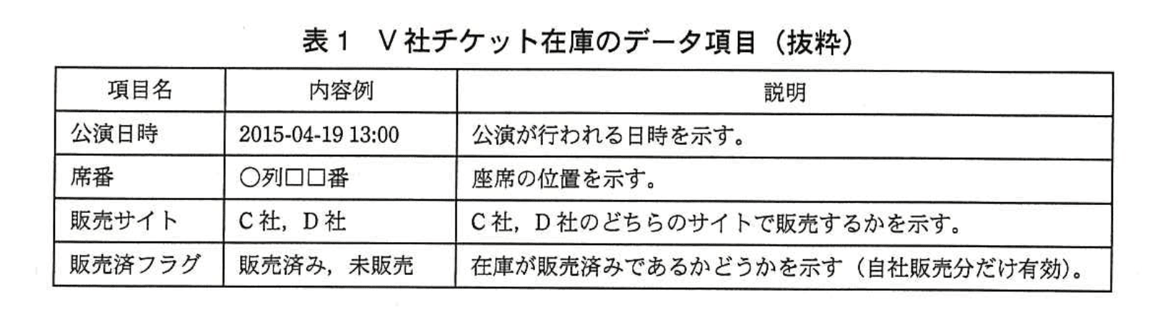 C社、D社で保持する V社チケット在庫のデータ項目〔抜粋〕を表1に示す。チケット在庫データは、公演の全席分を C社、D社の両社で保持する。データ項目は将来的に V社の意向によって追加される可能性がある。