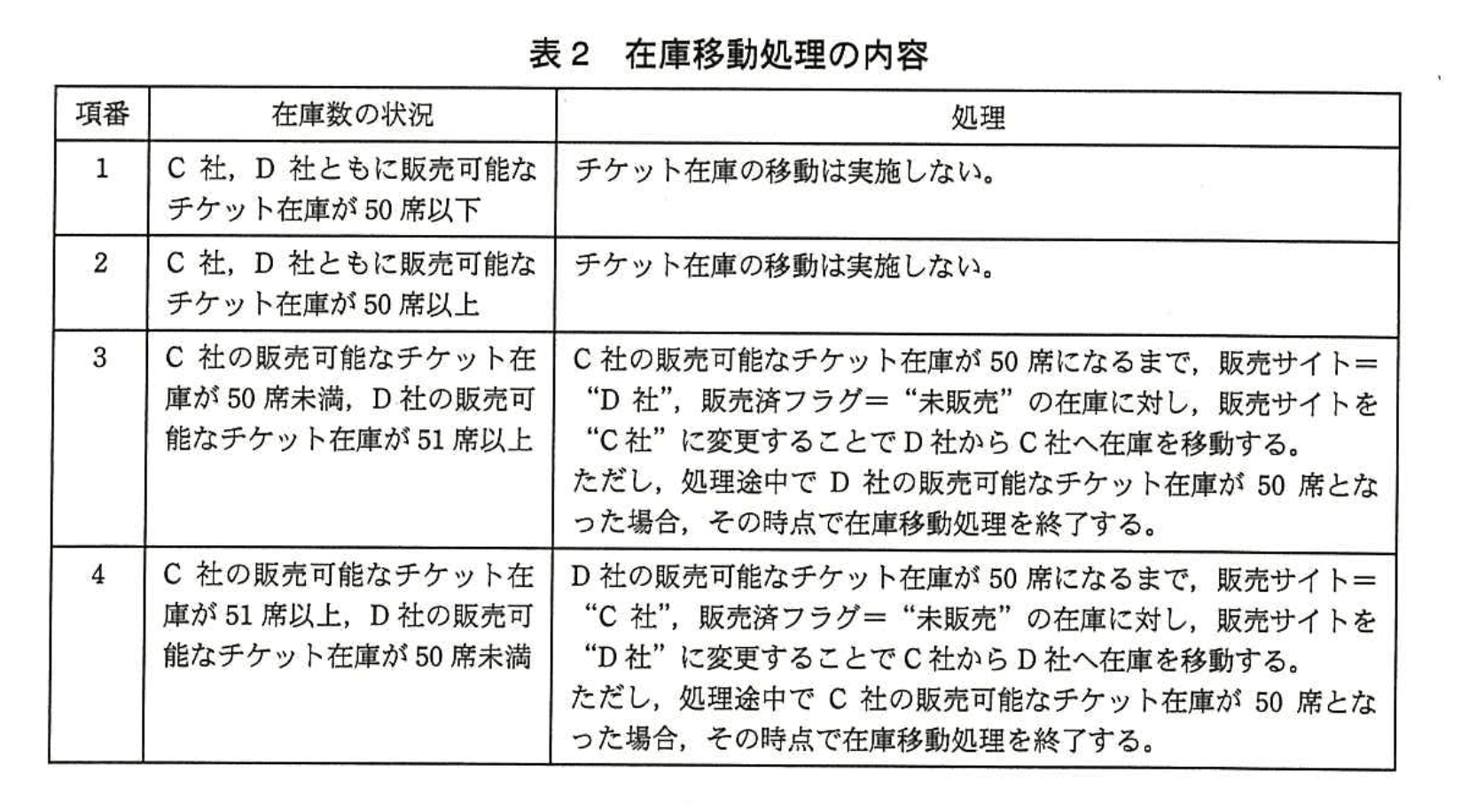 という“二重在庫”が生じ、両サイトで当該座席が購入できてしまいます。したがって d は「販売可能」と判断できます。 - 表2の項番4は「C社の販売可能なチケット在庫が51席以上、D社の販売可能なチケット在庫が50席未満」という“C社→D社”への在庫移動ケースです。同様にエラーが起きると、