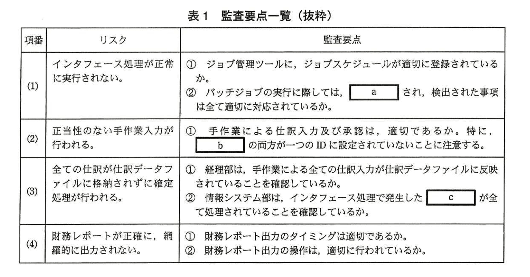 - 表1の項番「(1)」はリスクを「“インタフェース処理が正常に実行されない。”」と定義しています。これはジョブが異常終了して会計データが落ち込まない事態を想定した論点です。
