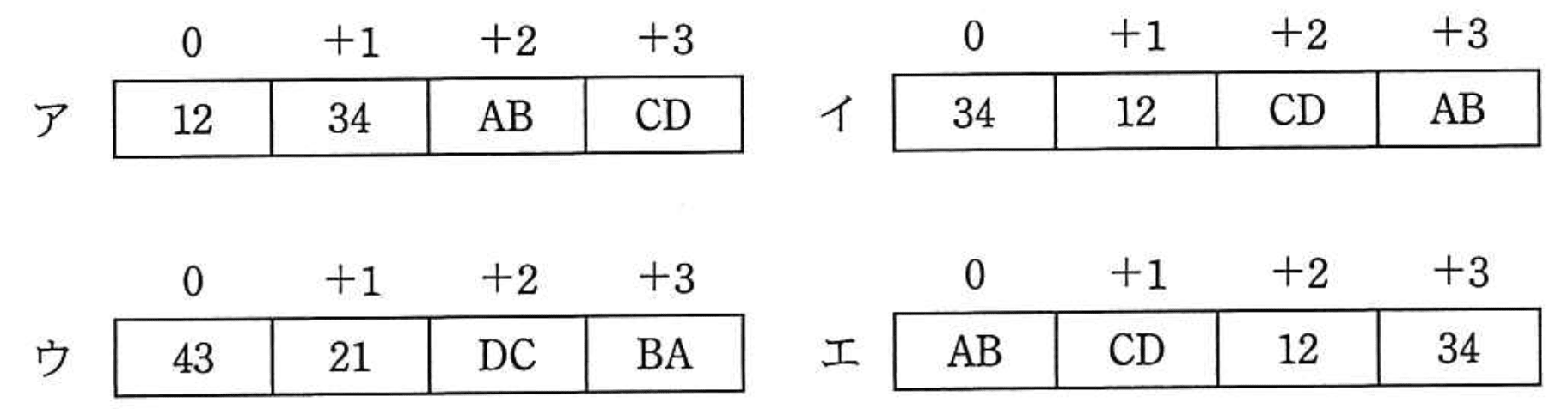 - ア:オフセット0に「12」となっており、リトルエンディアンの最下位バイト「34」が先頭に来ていないため誤り。