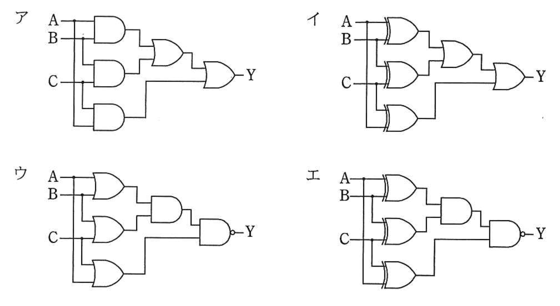 - エ:NANDゲートとANDゲートの組み合わせで否定が多く、真理値表の多数決回路の動作と一致しない。