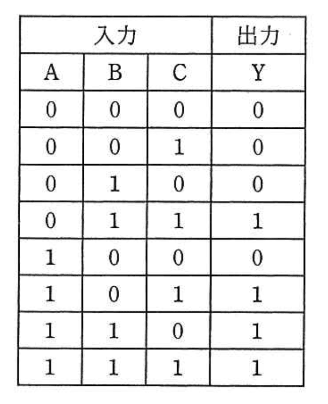 - 真理値表を確認し、出力Yが1となる条件を整理する(入力が2つ以上1のとき)。