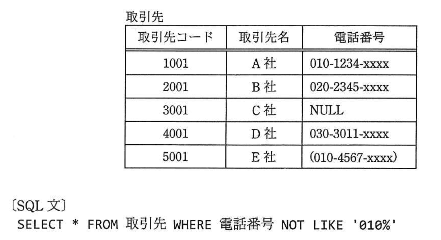 NOT LIKEもNULLに対してはFALSE扱いとなり、結果セットに含まれません。NULLの扱いはSQLの基本であり、試験でも頻出のポイントです。