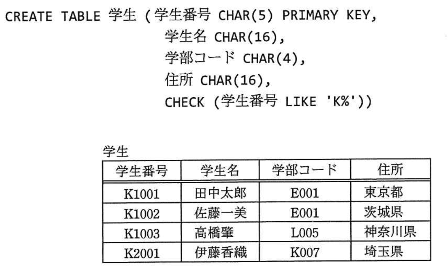 CREATE TABLE 学生(学生番号 CHAR(5) PRIMARYKEY,