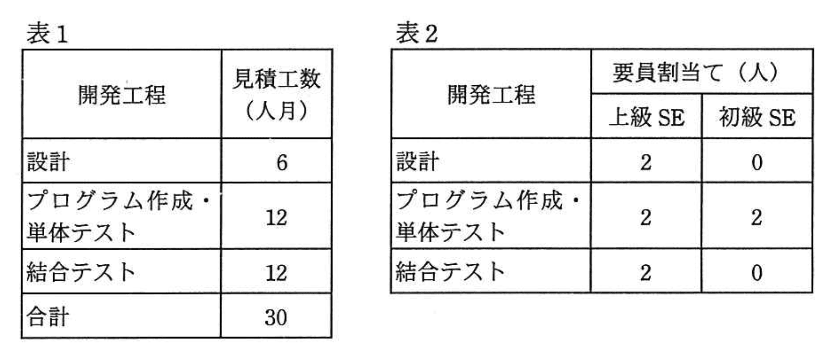 あるプログラムの設計から結合テストまでの作業について、開発工程ごとの見積工数を表1に示す。また、開発工程ごとの上級SEと初級SEの要員割当てを表2に示す。上級SEは、初級SEに比べて、プログラム作成・単体テストについて2倍の生産性を有する。表1の見積工数は、上級SEの生産性を基に算出している。
