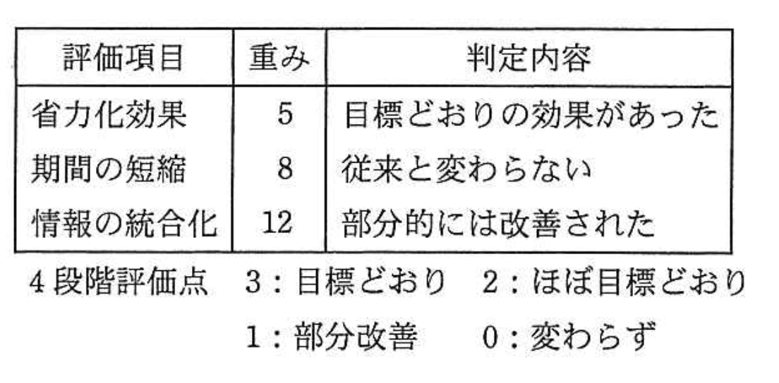 判定内容を4段階評価点に置き換えると、「目標どおりの効果があった」は3点、「従来と変わらない」は0点、「部分的には改善された」は1点となります。