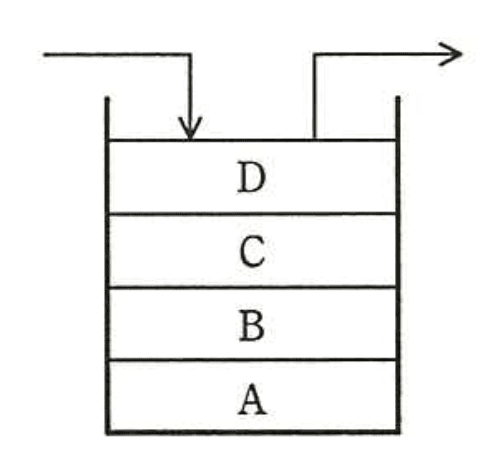 - 問題の図でスタックの上から順にD、C、B、Aと積まれていることを把握する。