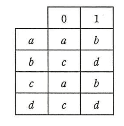 表は、入力記号の集合が {0, 1}、状態集合が である有限オートマトンの状態遷移表である。長さ3以上の任意のビット列を左(上位ビット) から順に読み込んで最後が 110で終わっているものを受理するには、どの状態を受理状態とすればよいか。