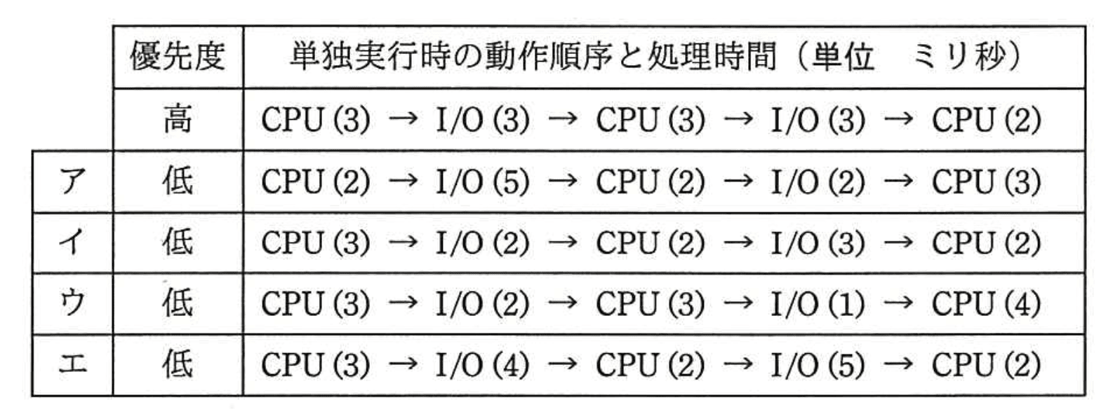 - ア:CPU処理時間が短いがI/O時間が長く、CPUの遊休時間が増える。