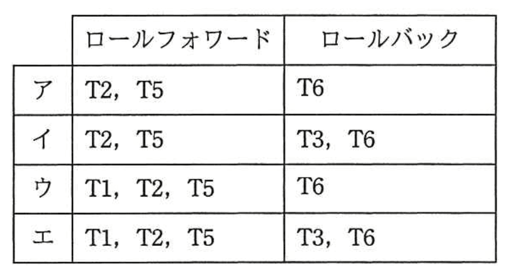 DBMS をシステム障害発生後に再立上げするとき、ロールフォワードすべきトランザクションとロールバックすべきトランザクションの組合せとして、適切なものはどれか。ここで、トランザクションの中で実行される処理内容は次のとおりとする。