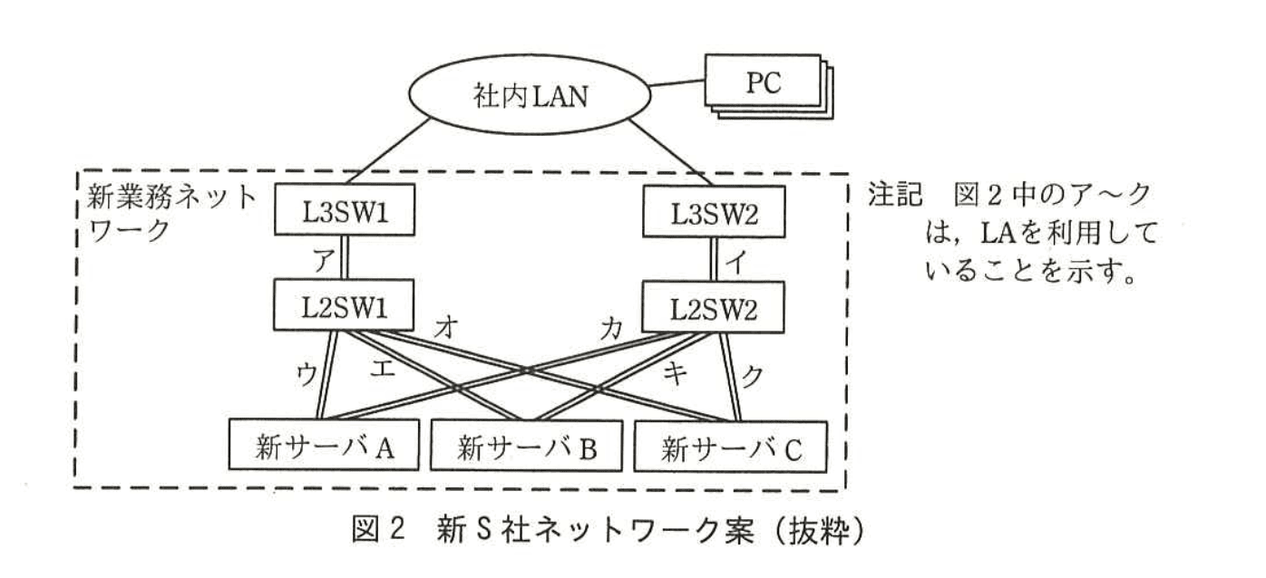 「ア L3SW1―L2SW1」および「イ L3SW2―L2SW2」。 - 【問題文】「LA を利用して 1 G ビット/秒のリンク 2 本で接続すると、その帯域は理論上 2 倍になる。」