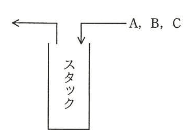 スタックは後入れ先出しの構造で、A, B, Cを順に入れながら1回ずつ出す操作を考えます。
