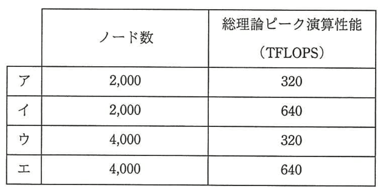 - エ:ノード数4,000は誤り。性能640TFLOPSは正しいがノード数が合わない。