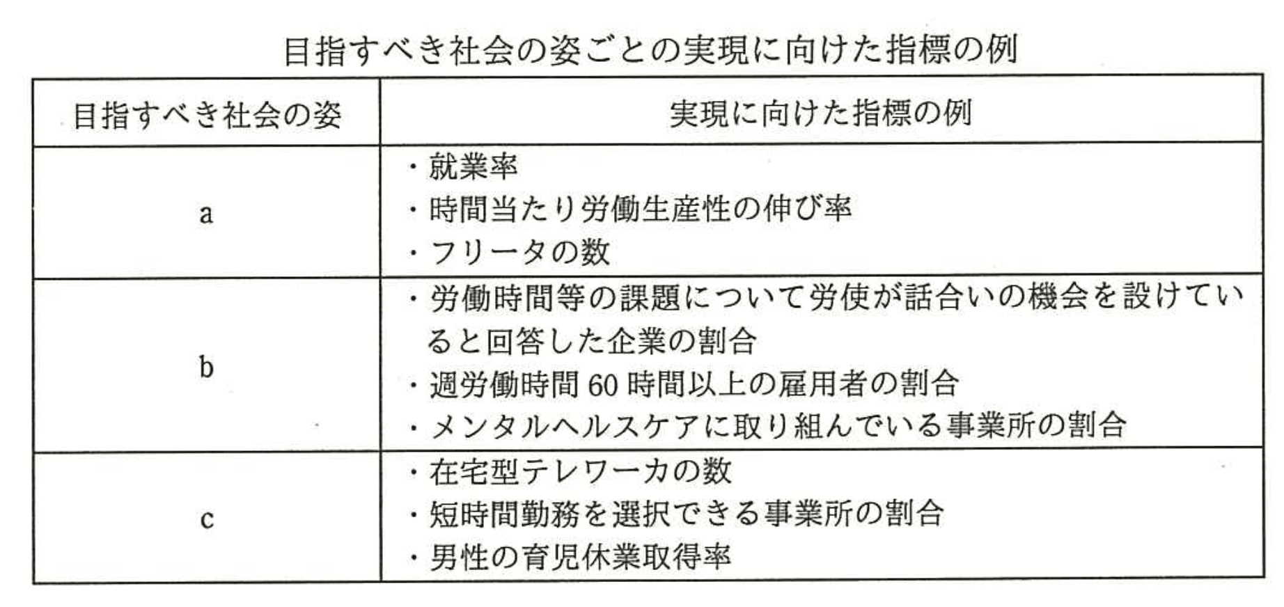- エ: 「多様な働き方・生き方が選択できる社会」はcの指標内容と完全に一致します。