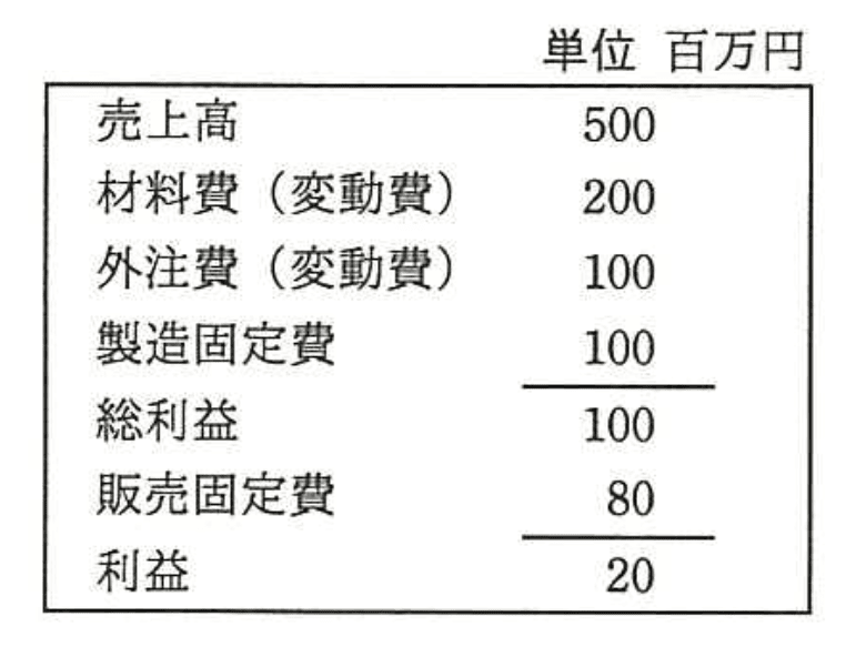 変動費は材料費200百万円+外注費100百万円=300百万円、売上高は500百万円なので変動費率は300/500=0.6。