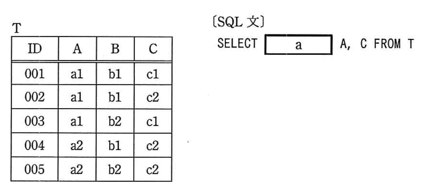 関係R (ID, A, B, C)の A,Cへの射影の結果と SQL文で求めた結果が同じになるように、a に入れるべき字句はどれか。ここで、関係Rを表Tで実現し、表Tに各行を格納したものを次に示す。