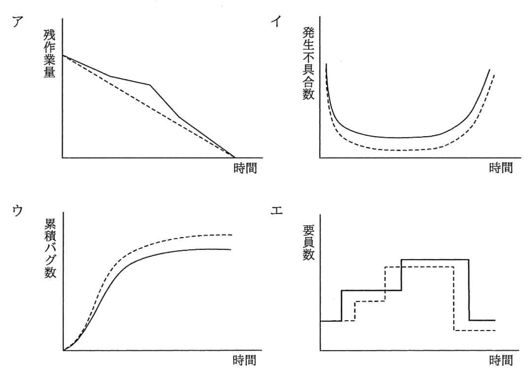 - ウ:縦軸が「累積バグ数」で、時間とともに増加し最終的に横ばいになるS字曲線であり、バーンダウンチャートとは異なります。