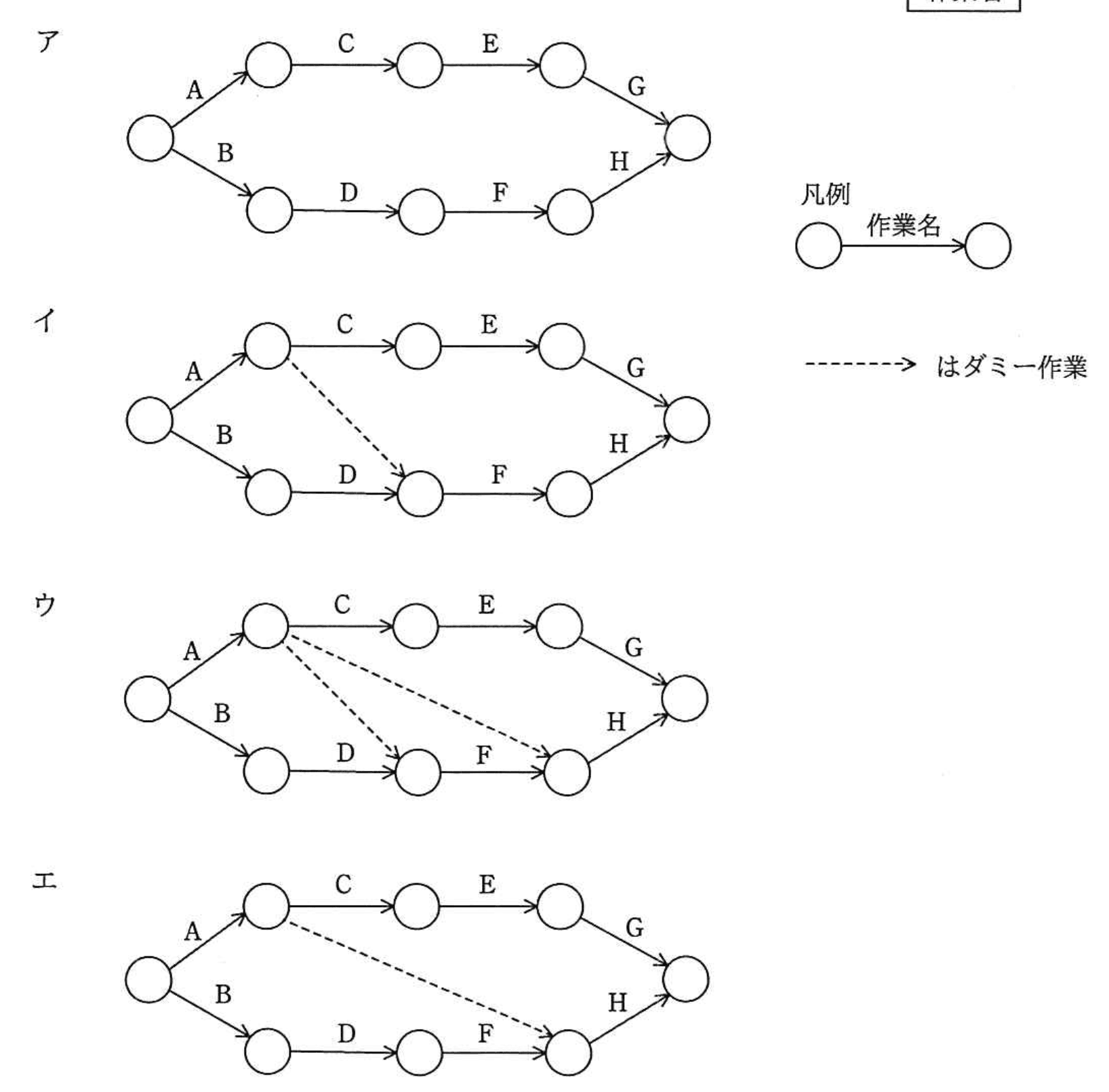 - エ:ダミー作業が不足しており、作業Aから作業Fへの依存関係が正しく表現されていません。誤りです。