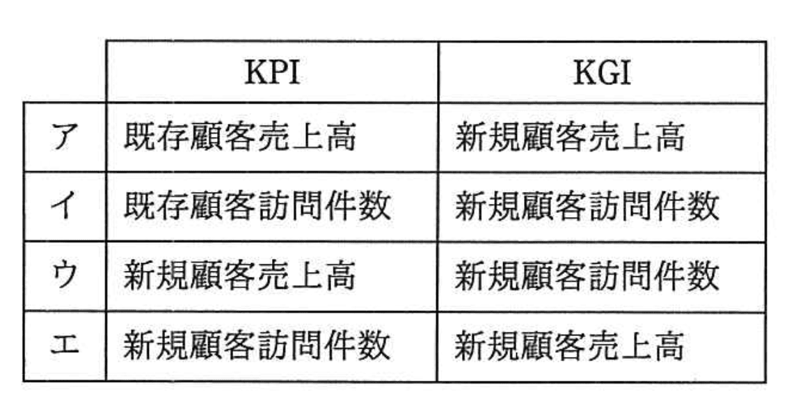- エ:「新規顧客訪問件数」がKPI、「新規顧客売上高」がKGIで、正しい役割分担となっている。