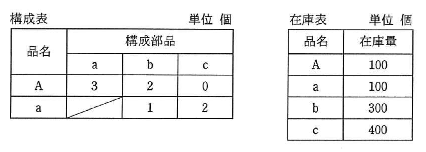 - 根拠:製品A1個あたりに部品bが2個必要で、300個出荷で600個必要。aの在庫や構成も考慮し、仕掛・注文残なしのため単純計算で求まる。
