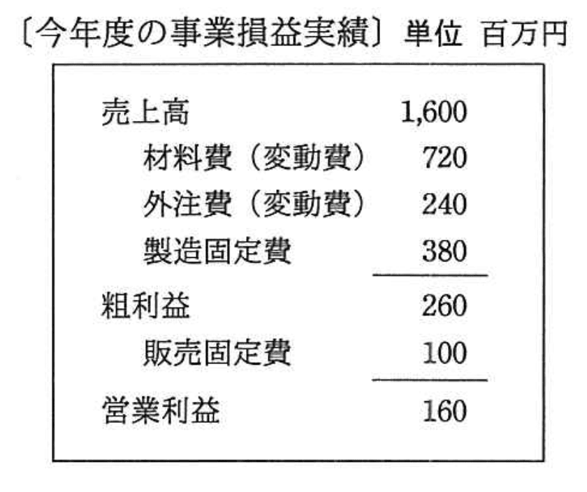今年度の変動費は材料費720百万円+外注費240百万円=960百万円で、売上高1,600百万円に対する変動費率は60%(960÷1,600)。