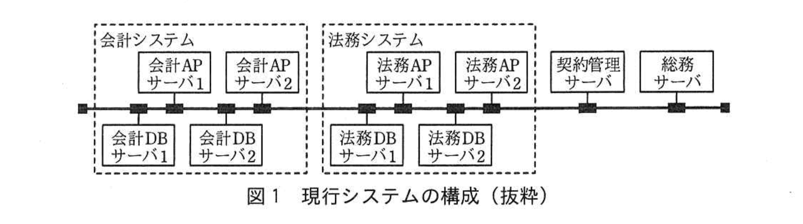 会計システムと法務システムは、それぞれアプリケーションサーバ(以下、APサーバという)とデータベースサーバ(以下、DBサーバという)の2種類のサーバで構成されており、契約管理システムと総務システムは、それぞれAPサーバとDBサーバを兼用するサーバで構成されている。会計APサーバは負荷分散装置によるアクティブ/アクティブ方式、法務APサーバは手動によるアクティブ/スタンバイ方式で冗長化され、DBサーバは両システムともアクティブ/アクティブ方式のクラスタリング機能をとっている。会計APサーバで処理するトランザクションは、会計APサーバ1と会計APサーバ2に均等に分散される。法務APサーバで現用系サーバが故障した場合、20分以内に待機系を手動で起動し、アクティブな状態できる。現行システムの構成を図1に示す。