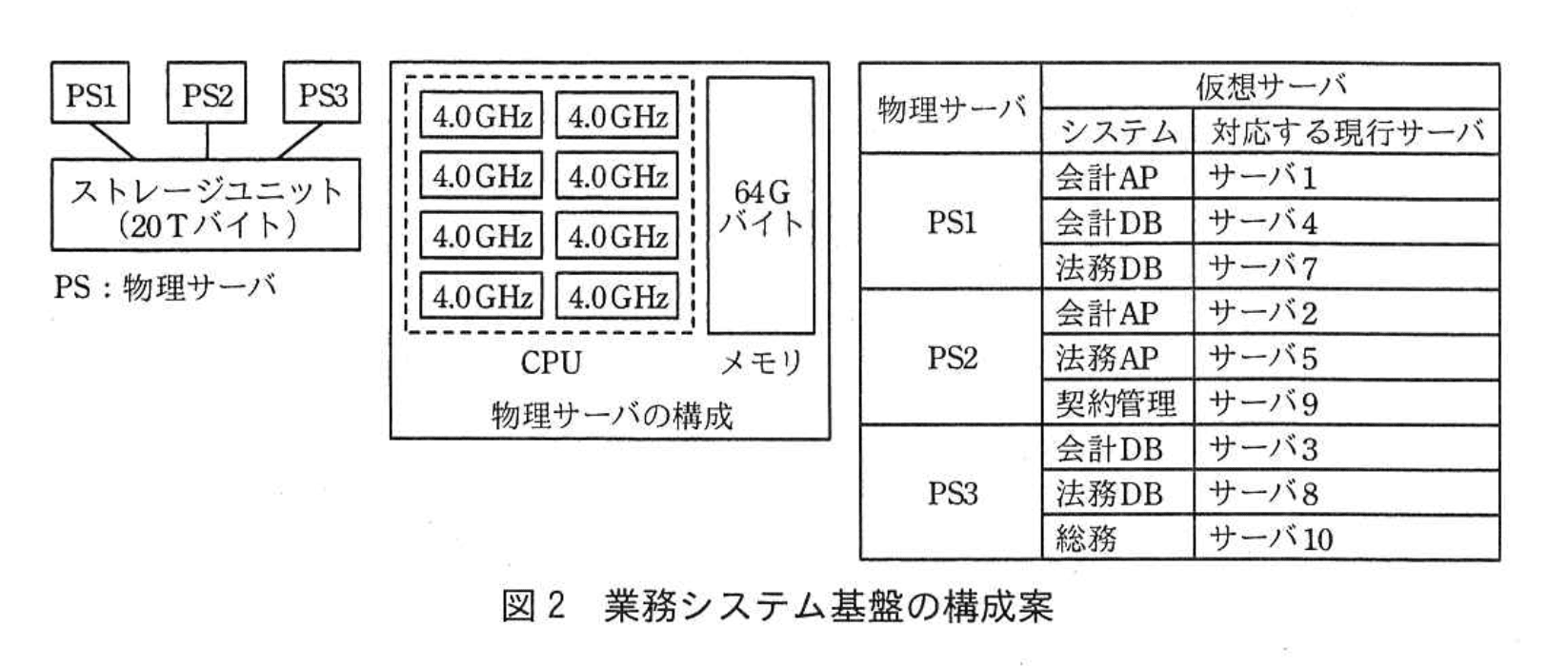 (2) ストレージユニットは物理サーバの共有ディスクとして接続する。各仮想サーバには現行システムと同容量をストレージユニットから割り当てるので、各仮想サーバに割り当てるストレージ容量の合計はストレージユニットの容量を超える。