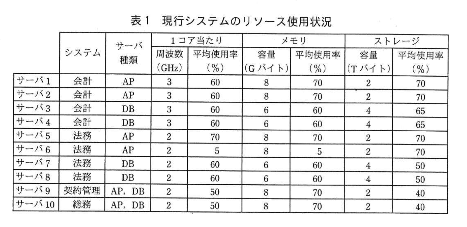 現行システムは、10台のサーバから構成されており、いずれのサーバにもCPU数は1でコア数が2の機器である。現行システムのリソース使用状況を表1に示す。