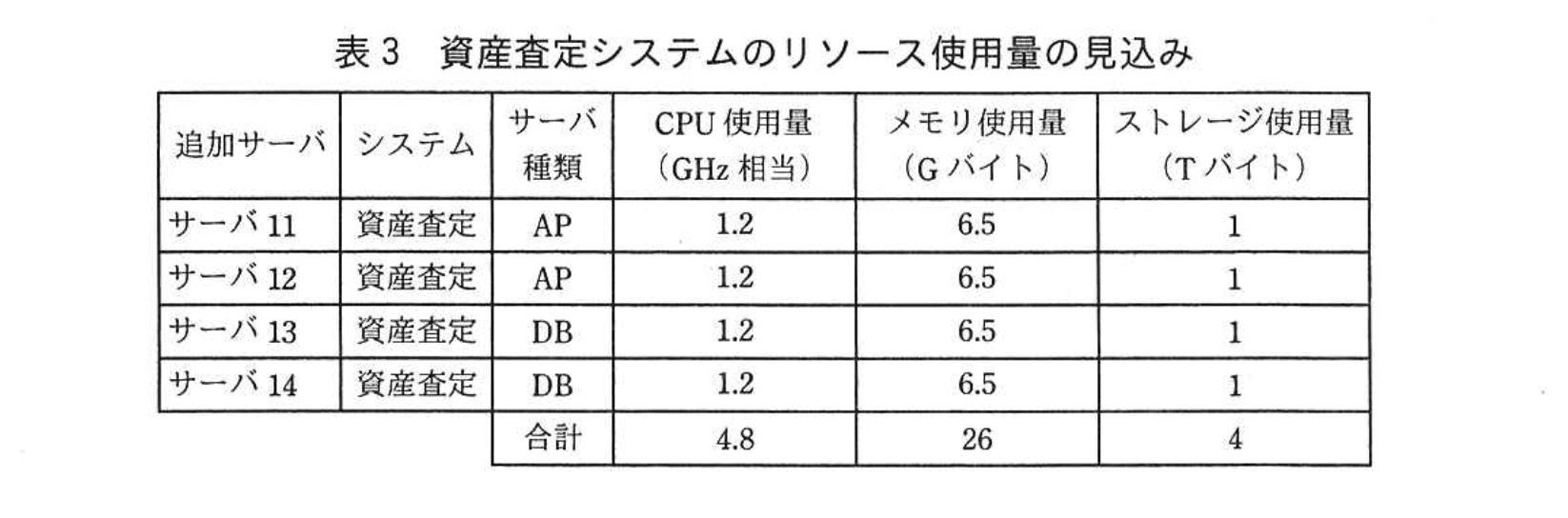 B課長が業務システム基盤の構成の設計を完了した後に、会計業務を統括する事務所長から、資産査定システムの追加を検討してほしいとの要望があった。B課長は資産査定システムを会計システムと同様なサーバ構成で構築することにし、必要なリソース量を調査した。資産査定システムのリソース使用量の見込みを表3に示す。