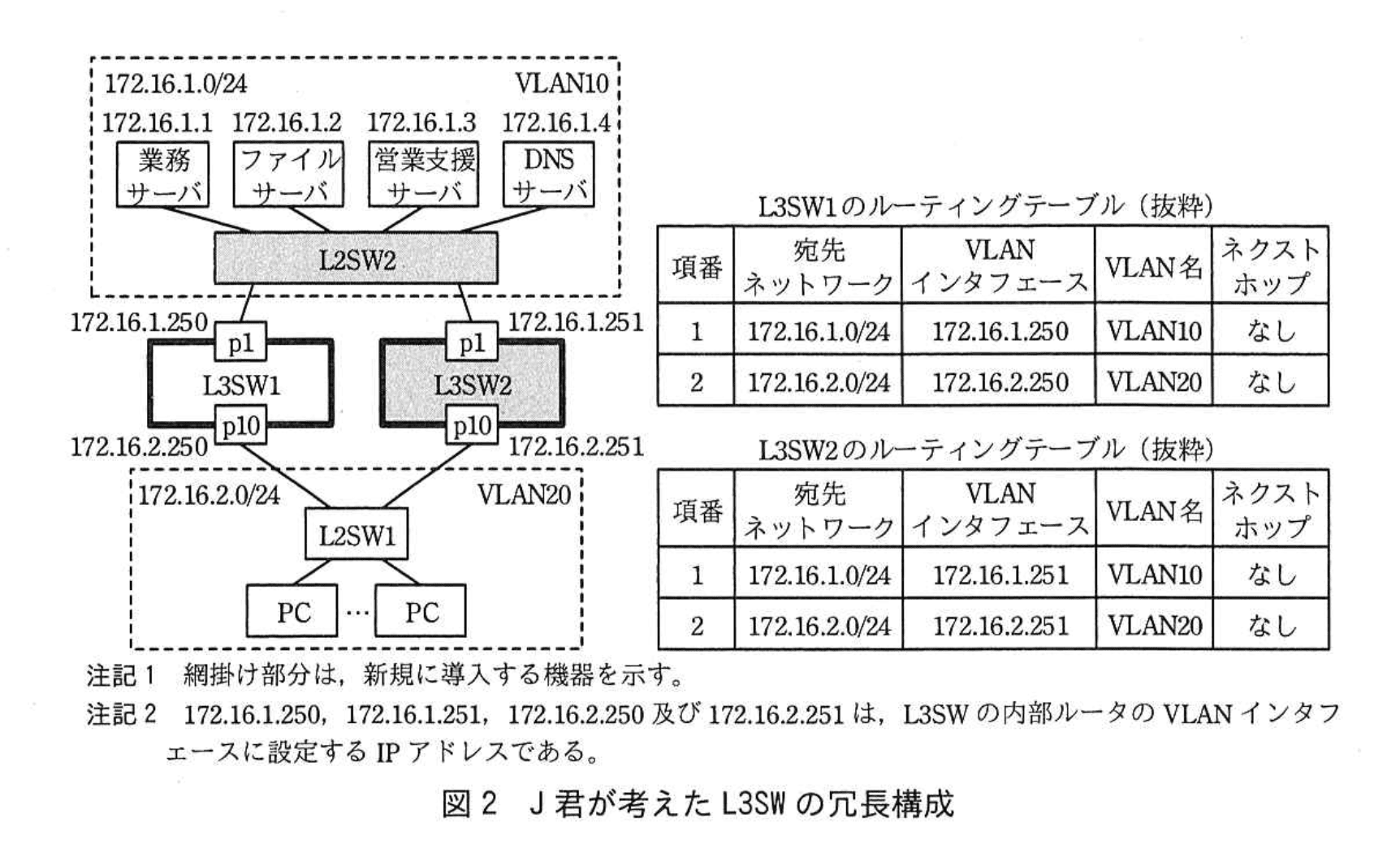 故障による業務の混乱が大きかったので、J君は、L3SW故障時もサーバの利用を中断させない改善策を検討した。J君が考えた、L3SWの冗長構成を図2に示す。