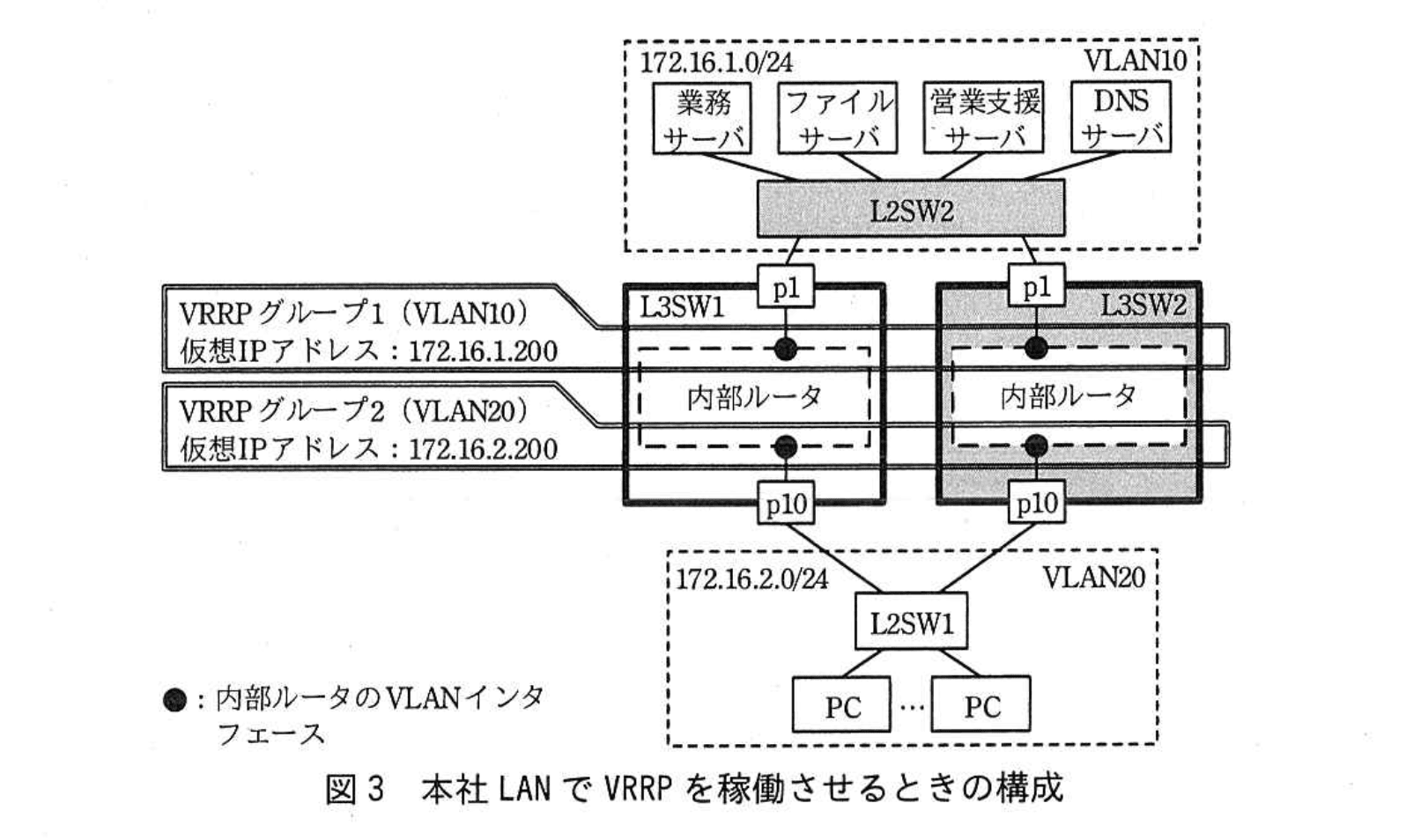 VRRP は、ルータを冗長化する技術である。L3SW で VRRP を稼働させると、L3SW の内部ルータのVLANインタフェースに仮想IPアドレスが設定される。本社 LAN で VRRP を稼働させるときの構成を、図3に示す。