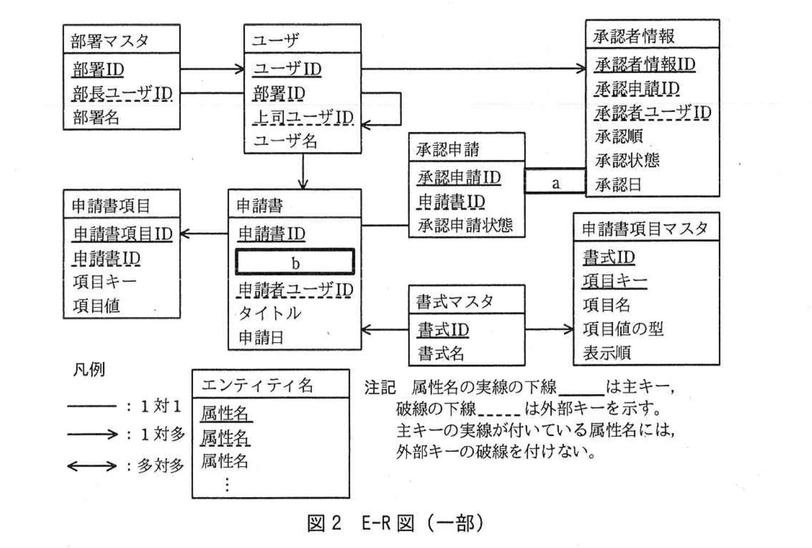 とあり、申請書 が どの書式で入力されたものかを識別する主キーは 書式マスタ 側の “書式ID” です。よって、申請書 には外部キー “書式ID” が必須となり、b には “書式ID” が入ります。 -