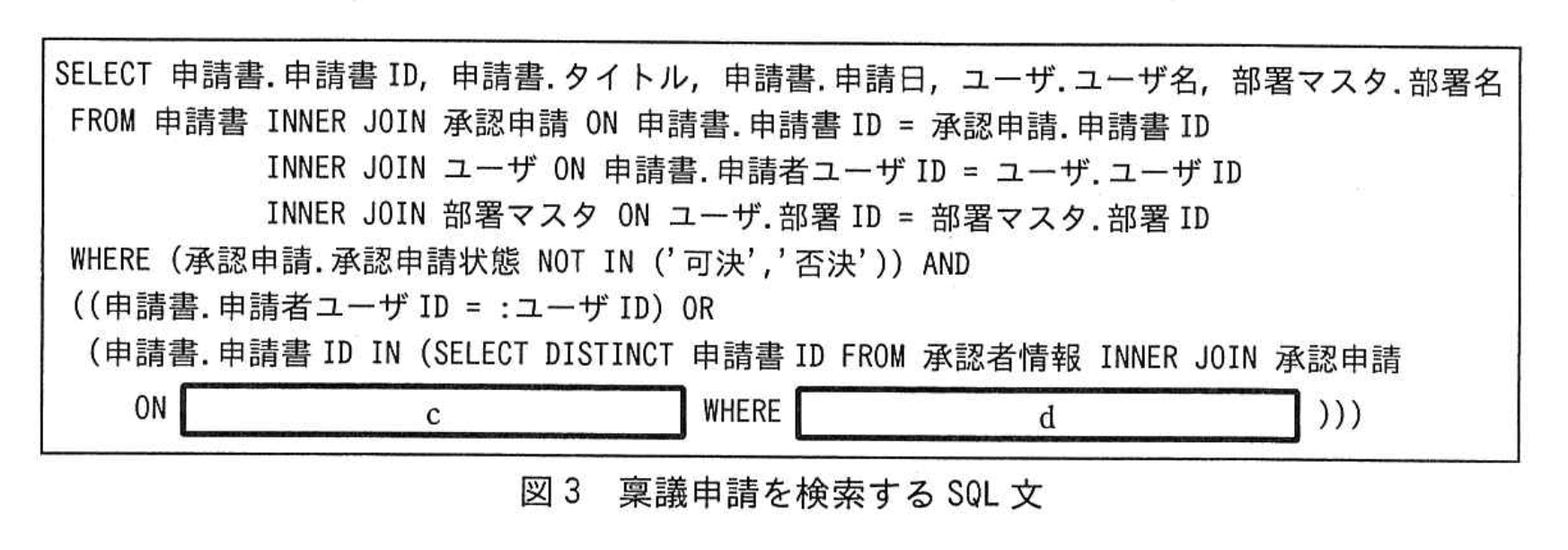 稟議申請の一覧画面には、申請書ID、タイトル、申請日、申請者のユーザID及び所属部署名を表示する。画面に表示する情報を検索するSQL文を図3に示す。ログイン中の利用者のユーザIDは、埋込変数':ユーザID'に設定されている。