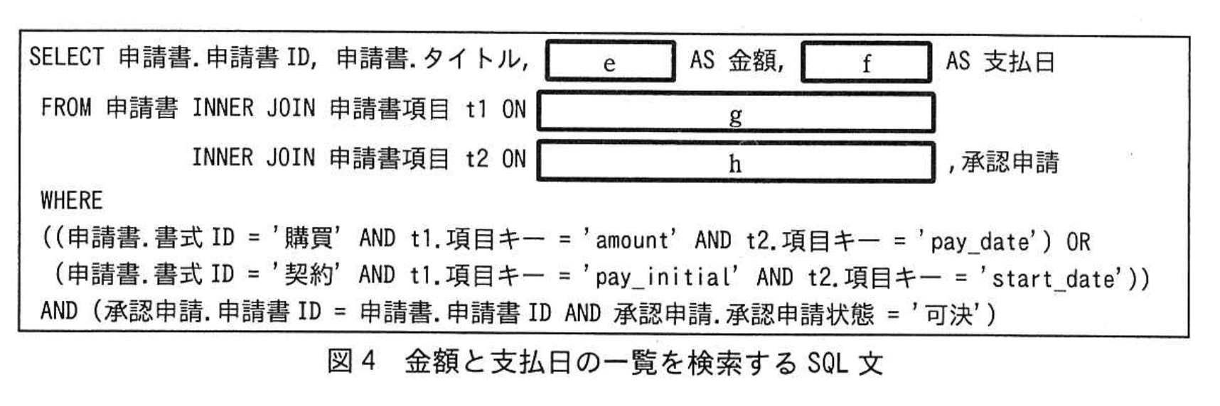 SELECT 申請書.申請書ID, 申請書.タイトル, e AS 金額, f AS 支払日