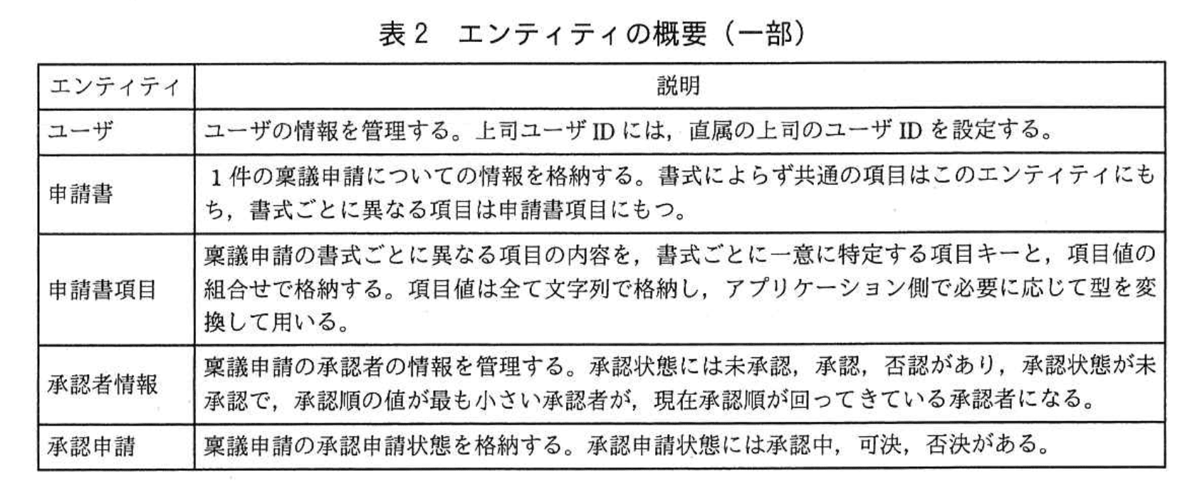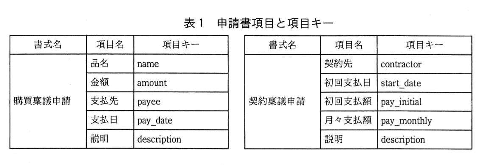 稟議申請の入力項目は申請書項目と呼ばれ、書式ごとに項目を一意に識別する項目キーと、項目値の組合せで管理される。項目の定義を表1に示す。