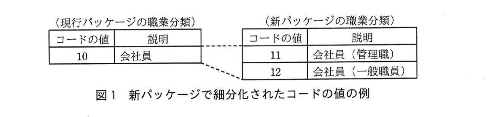 今回、新たなP社独自のカスタマイズ要件はない。新パッケージでは、主要なデータベース(以下、DBという)の一つである顧客属性管理テーブルの一部のコードの値が細分化された。新システムでは、新パッケージのコードの値を使用するが、今回は関連システムとの接続仕様を変更せず、新パッケージのコードの値を現行パッケージのコードの値に変換してから関連システムに引き渡すことにした。新パッケージで細分化されたコードの値の例を、図1に示す。