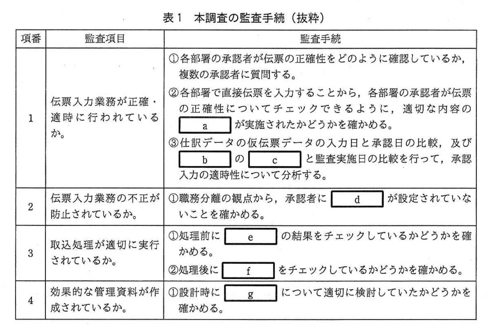 表1の監査項目「伝票入力業務の不正が防止されているか。」では、不正防止の基本原則である職務分離を確認しています。