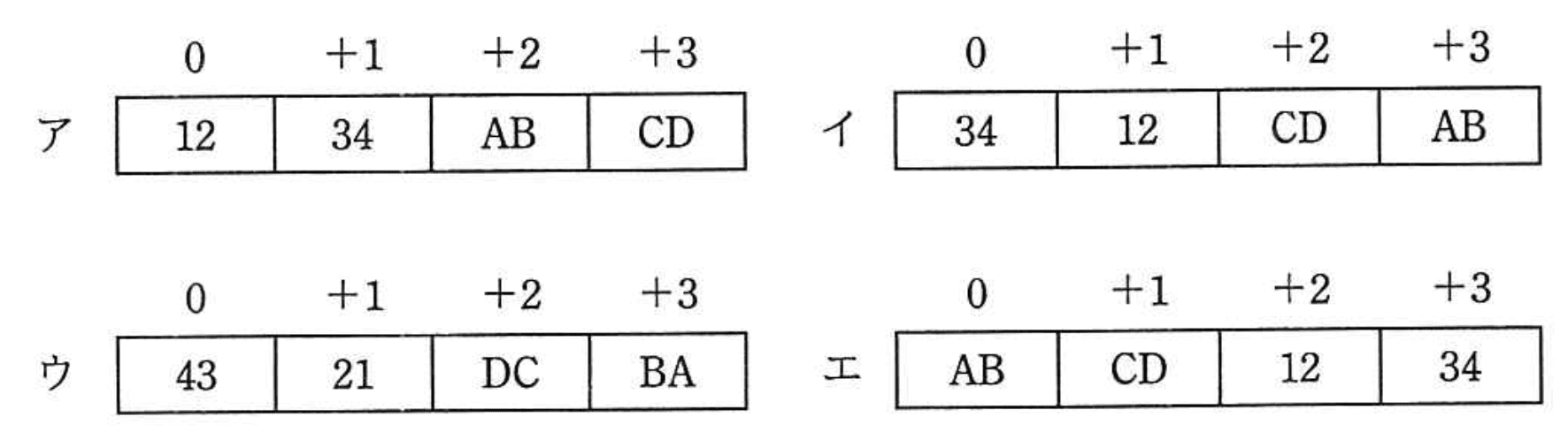- エ:AB, CD, 12, 34 はビッグエンディアンの配置で、リトルエンディアンではない。