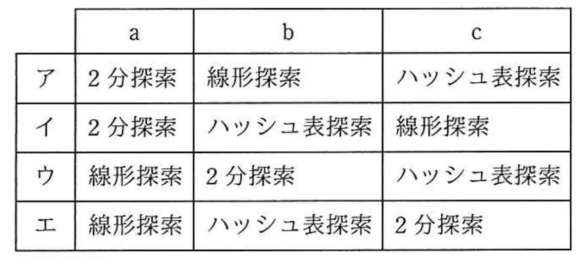 - イ:bにハッシュ表探索を選んでいるが、bは使用頻度順でハッシュ表は不適切。