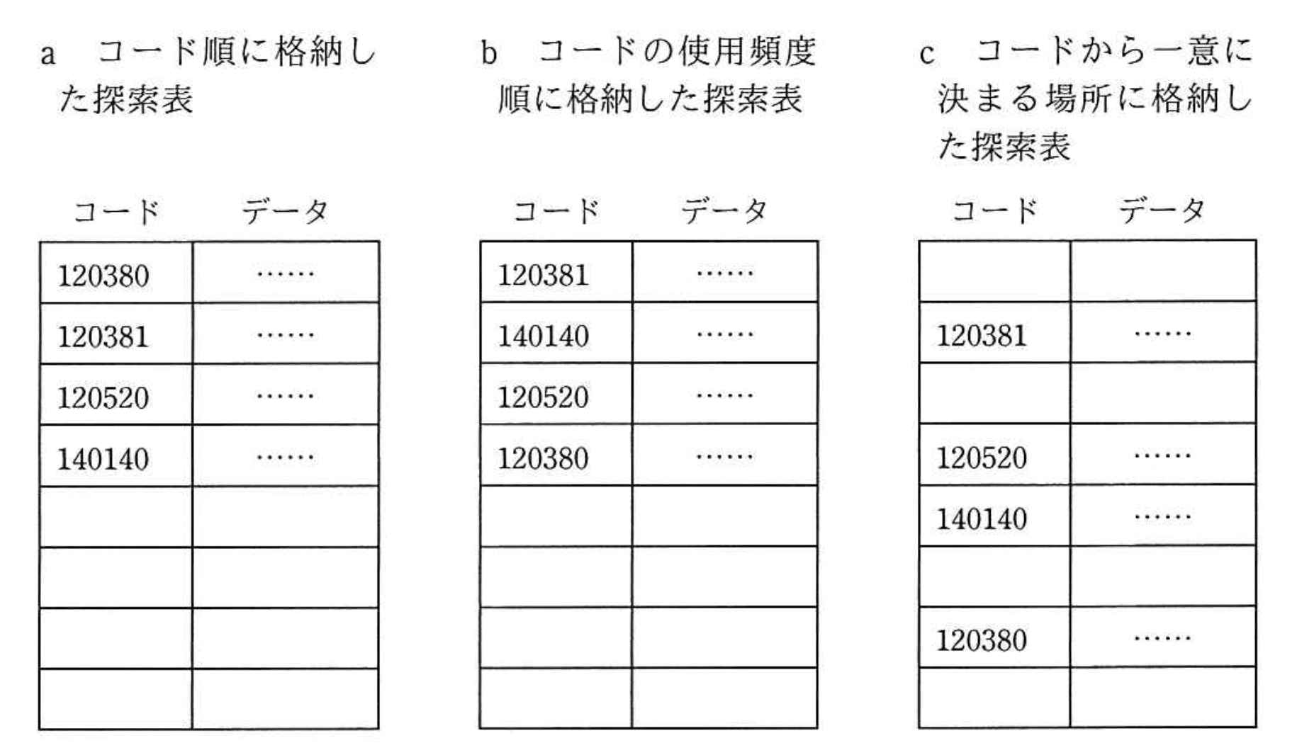 探索表の構成法を例とともにa〜cに示す。最も適した探索手法の組合せはどれか。ここで、探索表のコードの空欄は表の空きを示す。