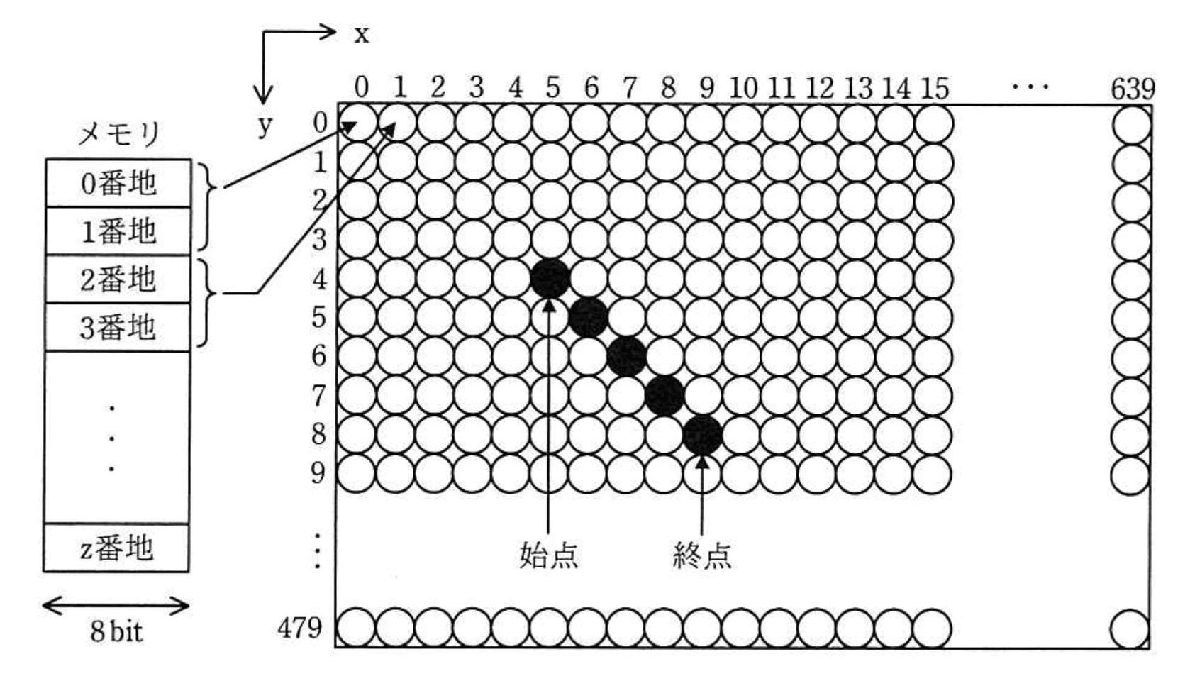 次の方式で画素にメモリを割り当てる 640×480のグラフィック LCD モジュールがある。座標 (x, y)で始点 (54) から終点 (98) まで直線を描画するとき、直線上の x=7の画素に割り当てられたメモリのアドレスの先頭は何番地か。
