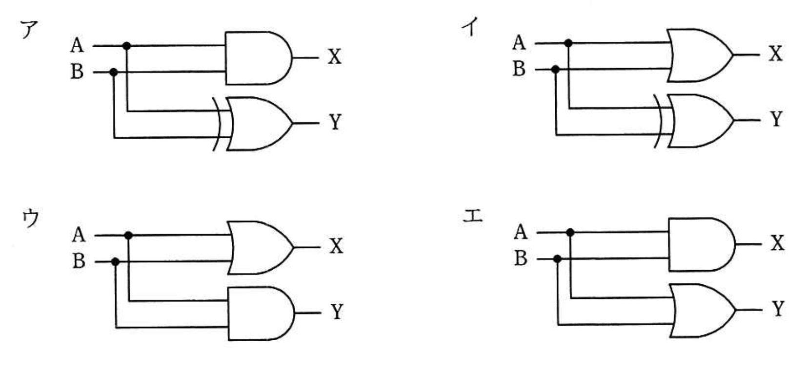1桁の2進数 A,Bを加算し、Xに桁上がり、Yに桁上げなしの和 (和の1桁目)が得られる論理回路はどれか。