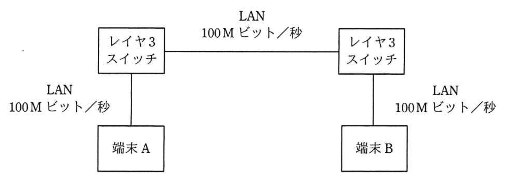 端末Aから端末Bまでの経路は、端末A→レイヤ3スイッチ1→レイヤ3スイッチ2→端末Bの3区間のLAN伝送があり、それぞれ100Mbpsの速度です。