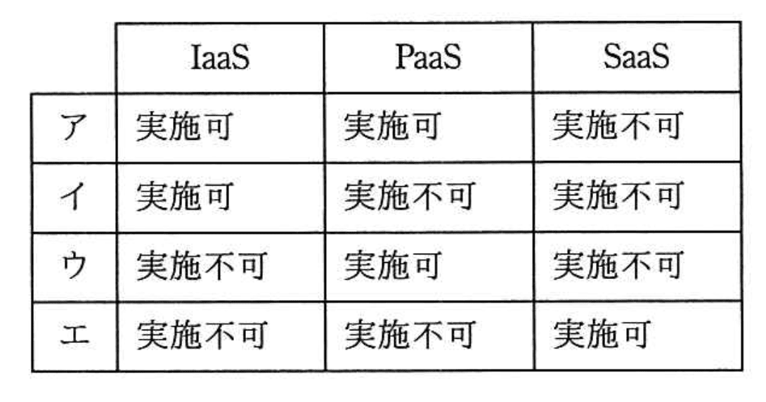 - ウ:IaaSで「実施不可」としているが、IaaSはユーザーがOS管理可能なので誤り。