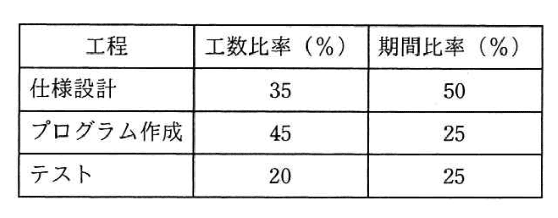 - 根拠:プログラム作成の工数は120人月の45%で54人月、期間は全体の25%の3か月。